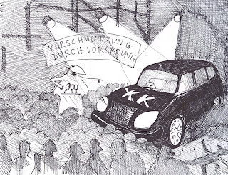 “I vill create a kabbage-souper fok of carbon dioxide and noxious fumes, so thick and dark, zat as my Porsche Mephisto emerges from these black Wagnerian clouds, like a great gothic stallion of triumph emerging from the night and the fok, it vill strike terror into the feeble hearts of the Kommissariat Nomenklatura.” Wiederkoenig paused as the enormity of his messianic vision sank in. A stunned silence fell over the assembled reporters at the press conference. The odd whimper could be heard.